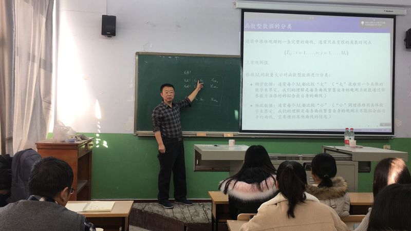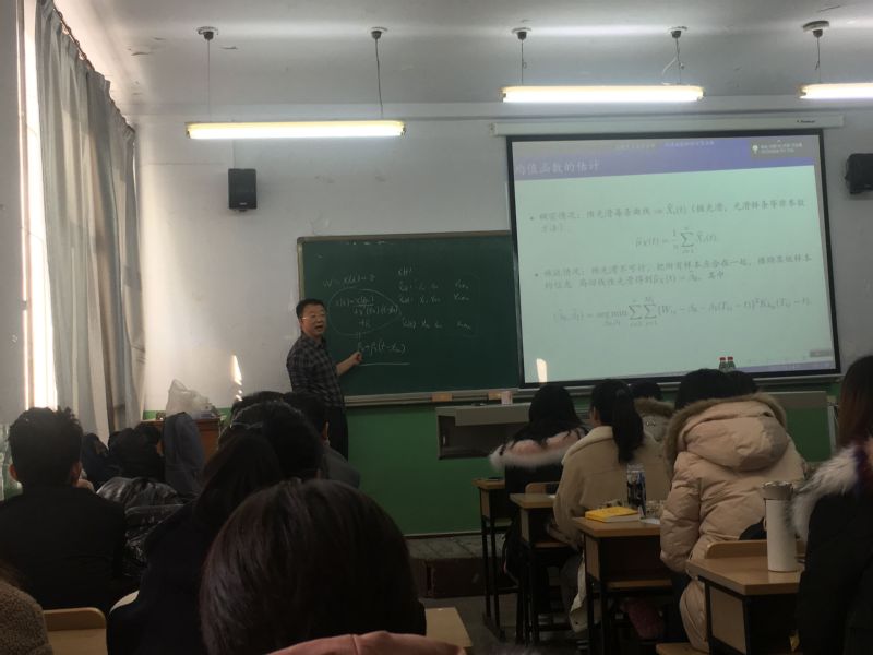 报告会中,张日权教授结合他多年的学习,教学和研究经验,向同学们介绍了函数型数据的概念。其中,张日权老师通过举心电图例子引入一维数据,又分别举例介绍二维及多维的概念。现实中很难观测到一条完整的曲线,只观测到的是集散的点。面板数据,纵向数据是函数型数据的特殊情况。函数型数据分成稠密数据和稀疏数据,并举出男女孩身高增长图作为实例。首先,对函数型数据分情况进行估计,并运用主成分方法对无限维进行降维成有限维,得出函数型主成分得分。接下来,张老师又对函数型数据进行回归模型的估计,分成四大类进行讲解,并对模型进行检验。最后,永利yl23411的老师和同学们与张日权老师进行了互动,同学们及时提出了自己的疑惑,张日权老师也对同学们提出的问题进行了详细的解答,又为同学们在这个方向上的学习给出了指导性的建议。并激励同学们要担负起数学与统计人才应有的使命,为我国的数学与统计学建设作出应有的贡献,也希望大家能够脚踏实地的学习理论知识,为数学与统计学的发展不懈努力。
