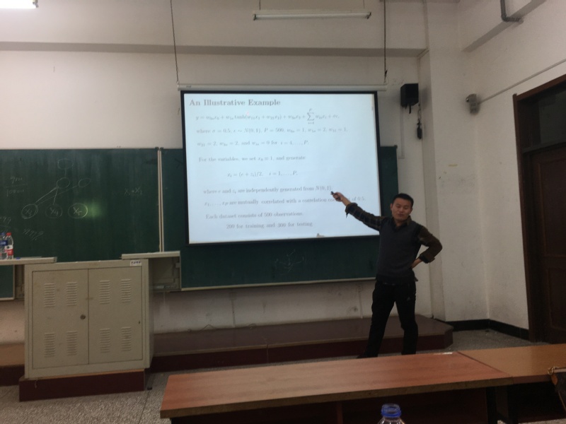 报告会中,李启寨老师结合自身多年的学习、教学和科研经验,从“生物标记”引出一个例子,介绍了两种变量选择方法:频率法和贝叶斯方法。接着,讲解了贝叶斯神经网络,用后验分布进行抽样,在理论的基础上,李老师给出了两个例子,用以说明理论的应用。最后,李老师对同学们提出的问题进行了详细的解答,也与公司里的老师进行了深入互动。