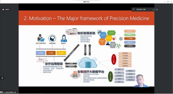 报告会中,王晗老师给出了他所理解的精准医疗的定义,即一系列应用和服务,基于集成生物学和信息科学的,以改善人类健康为目的的医学。后来王晗老师展示了精准医疗的实现过程和必要结构,其中有包含影响生物医疗大数据平台;涵盖数学统计、机器学习、人工智能、深度学习、分类聚类的知识发现系统;诊疗应用框架,构建上层应用系统,让知识服务于应用。强调了机器学习在服务于精准医疗时半结构化和动态变化的优势和特点。