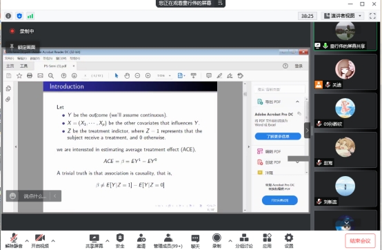 报告中,童行伟教授通过现实中的实际例子,例如注射新冠疫苗和打太极的产生的效果等,生动形象地向我们讲解了因果推断的相关概念与研究内容。童行伟教授还介绍了一种基于倾向得分的使用B样条的新半参数估计策略,该策略不依赖于参数模型规范。通过解决误差异方差性进一步提高了估计器的效率,还建立了两个估计量的渐近性质。模拟研究表明,该方法与许多竞争估计器相比具有优势且优于加权估计器,因为它不受极端权重的影响。该方法应用于2012年俄亥俄州医疗补助评估调查(OMAS)的数据,估计了医疗保险对根据“平价医疗法案”选择补贴保险计划的人群自我报告的健康状况的影响。