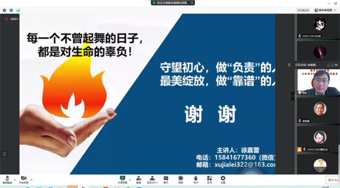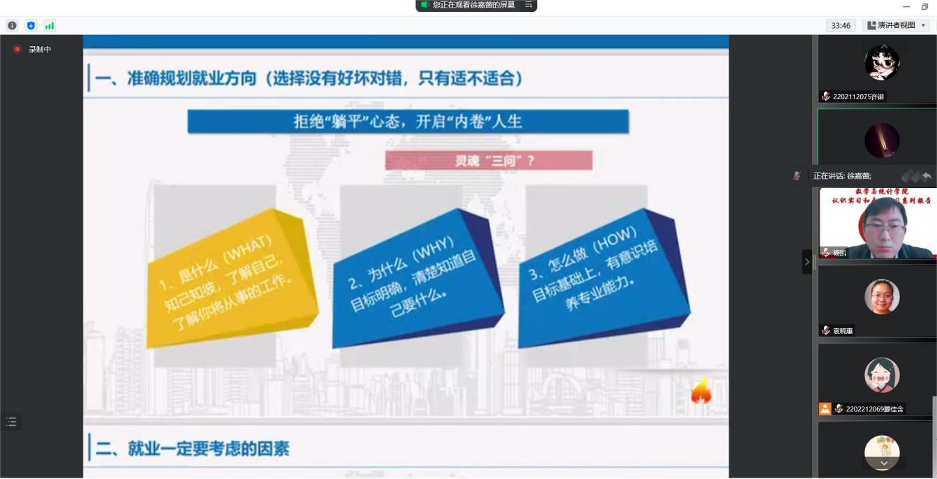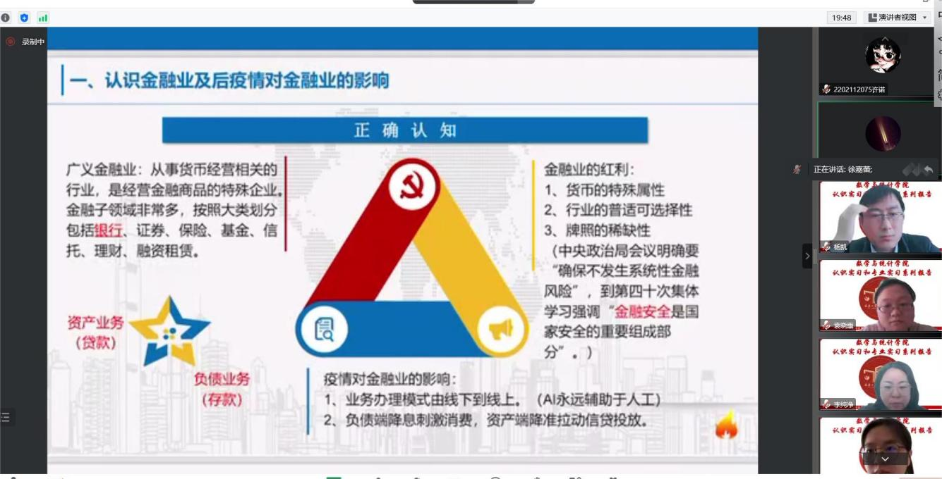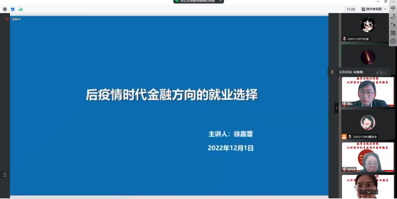 (通讯员:杨凯)2022年12月1日下午14:00,公司邀请中国建设银行锦州城南支行徐嘉蕾行长做题为《后疫情时代金融方向的就业选择》的报告,本次报告由公司统计系主任杨凯主持,公司副经理李纯净、统计系支部书记袁晓惠,以及统计系胡茜等青年教师以及2020级、2019级本科生以及研究生参加了本次线上报告。
