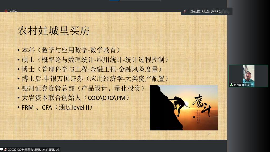 主讲人简介:大岩资本创始合伙人。北京工业大学管理科学与工程博士、概率论与数理统计硕士;上海社会科公司经济学博士后、荷兰蒂尔堡大学公派留学访问学者、香港科技大学访问学者,FRM。2008年至2010年,在申银万国证券任职,主要从事资产配置、风险管理和量化投资策略博士后研究。2010年至2012年,在中国银河证券资产管理总部任职,主要从事量化投资策略研究、产品设计等工作。2013年,作为联合创始人创立大岩资本,并担任首席风险官、投资经理等职位。