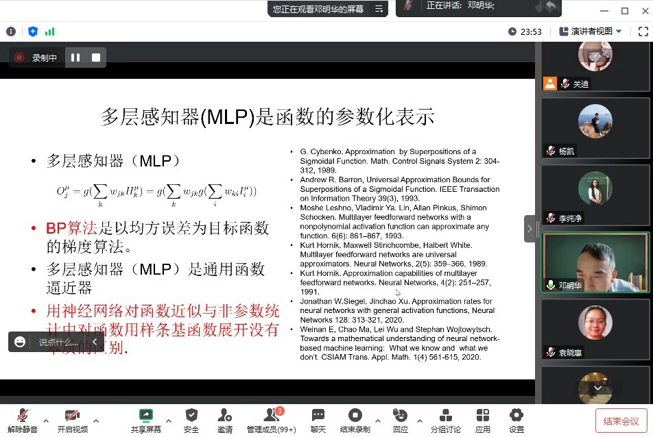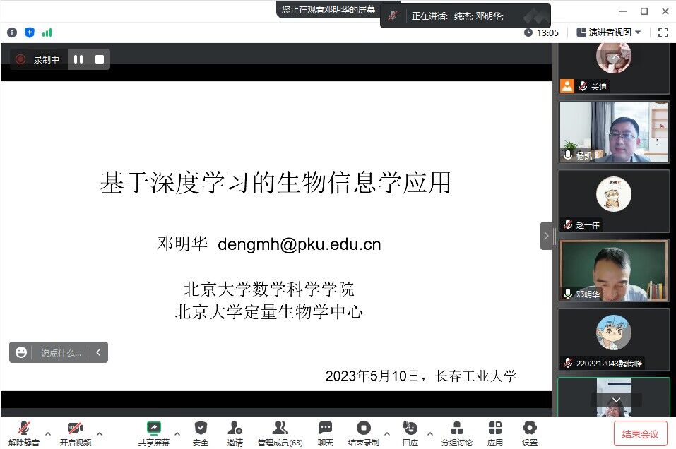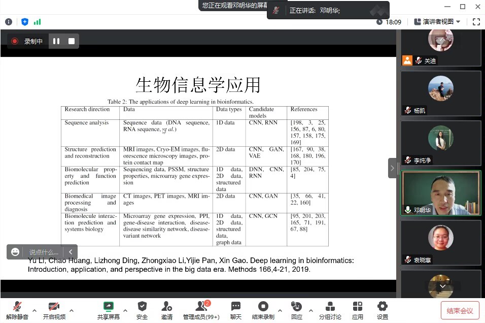 此次学术报告中,邓明华教授分别从背景、卷积神经网络、自编码器、迁移学习这四个方面向同学们讲解有关基于深度学习的生物信息学应用的相关知识。首先邓明华教授向同学们介绍了常用深度学习模型,接着又向同学们介绍了多层感知器(MLP)是函数的参数化表示以及邓明华教授的团队近期的课题研究工作。接下来的报告中,邓明华教授带领同学们了解了卷积的统计学含义、卷积步骤和邓明华教授的团队的有关卷积的研究方法。