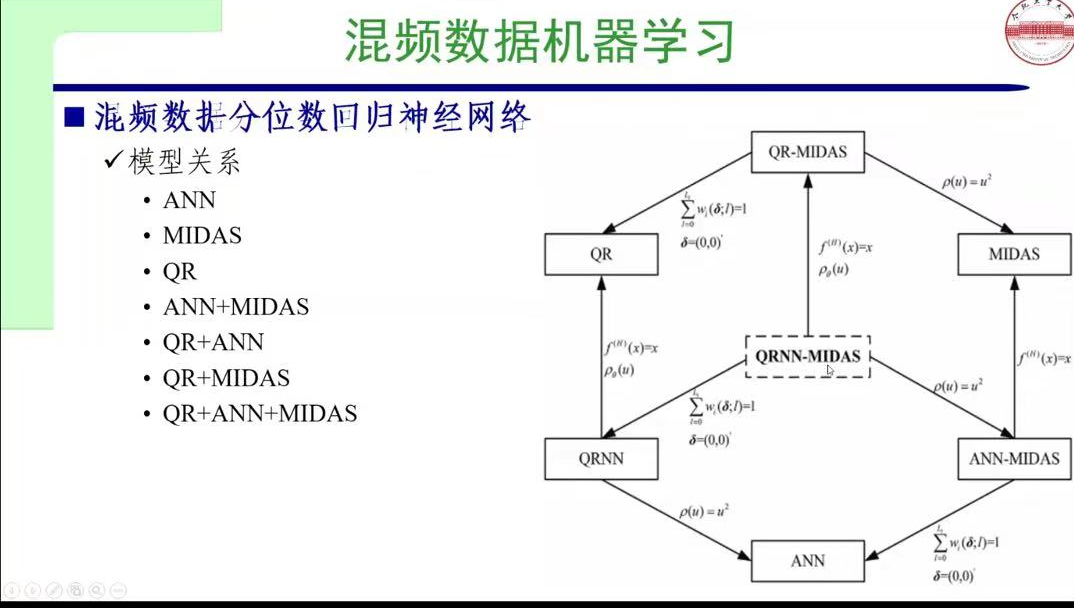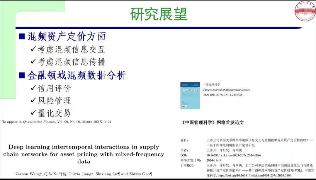 同时许教授还介绍了混频数据分析方法的流程。混频数据分析方法的处理方法包括传统的同频化混频抽样,如 Ghysels 等(2004,2007)提出的 MIDAS,以及刘汉与刘金全(2011)的实时预报,其理论基础是分布滞后模型。基本步骤有频率对齐、采用多项式权重函数约束状态空间模型,像 Liu 和 Hall(2003)提出的状态空间模型,其核心思想是将低频数据视为有缺失的潜在高频数据,估计方法包括卡尔曼滤波向量自回归。此外,还有 Zadrozny(1988)参数驱动的 MF - VAR 模型(类似状态空间模型)以及 Ghysels(2016)数据驱动的 MF - VAR 模型(类似 MIDAS 模型)。在后续报告中,许老师详细讲解了如何运用混频数据分析方法,即通过矩阵表达、频率对齐、参数约束和参数估计等步骤进行运算,同时讲述了混频数据的机器学习研究背景与模型建立情况。