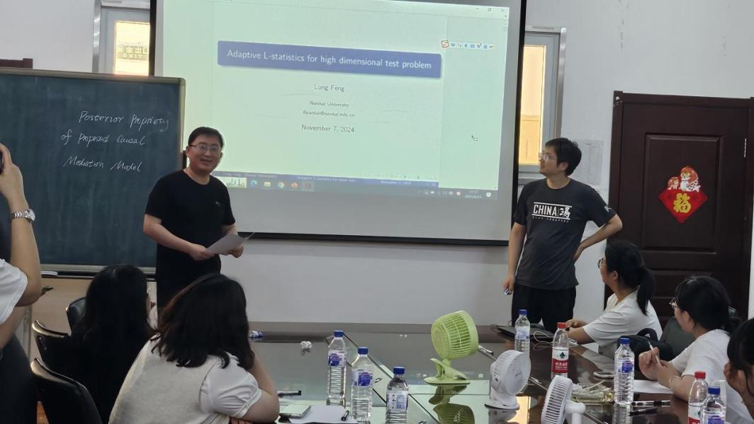 在题为"基于自适应L-statistics的高维均值检验"的学术报告中,冯龙教授向在场师生展示了他的最新研究成果。报告厅内座无虚席,有众多教师学者前来聆听,也吸引了大量对高维统计充满热情的员工。教授深入浅出地讲解了如何通过创新的L统计量方法解决高维数据检验难题,案例分析生动且逻辑推导清晰。