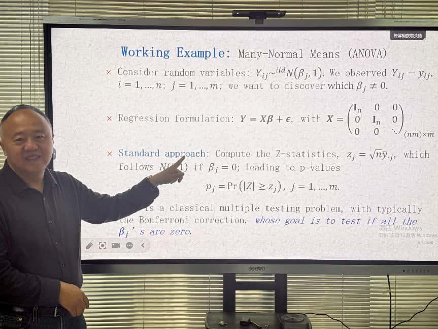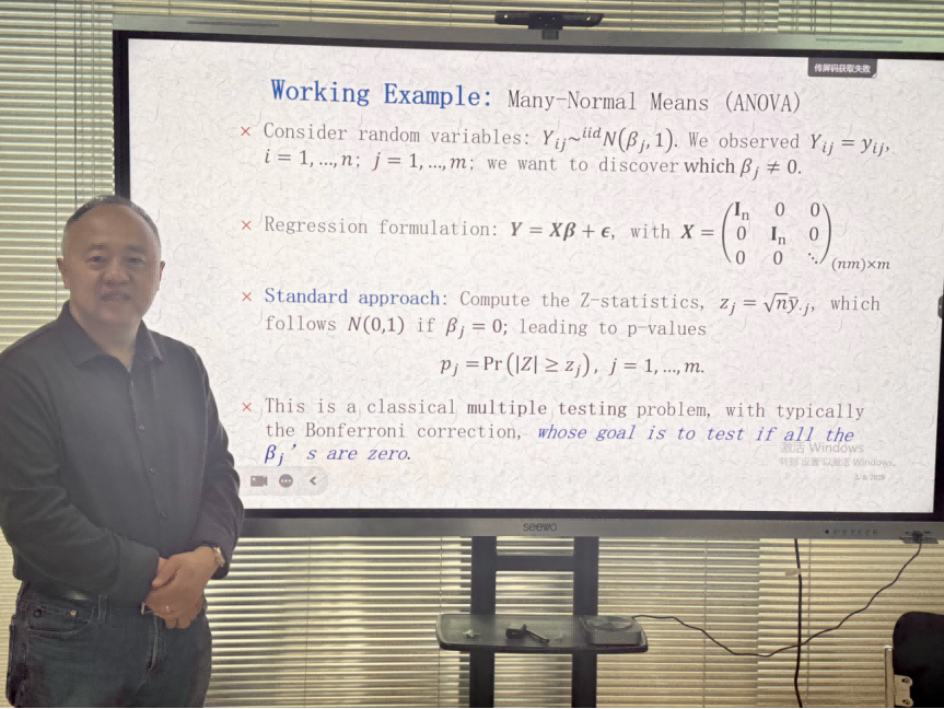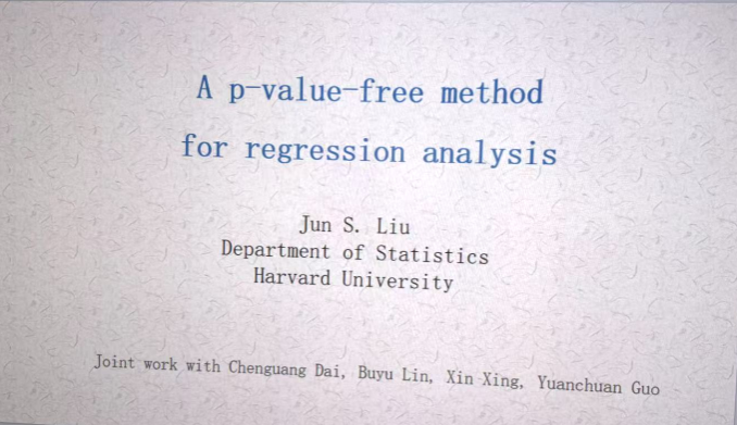 报告伊始,刘军教授从现代统计假设检验的视角切入,对p值问题的背景,渊源和优缺点进行了深刻的阐述,进一步讨论了多重检验等场景下,p值自由方法的好处,该方法十分具有启发性,引发了老师员工的极大关注。