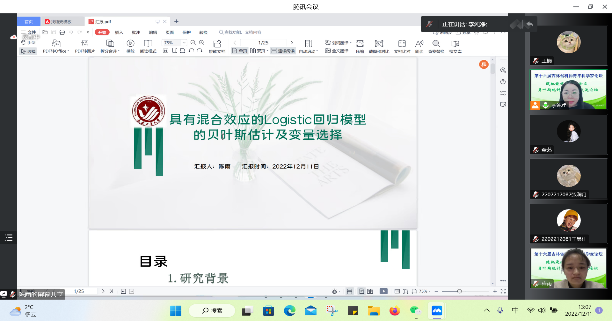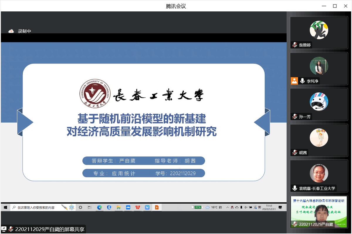 【通讯员 胡茜】2022年12月11日,上午9:30,由吉林省工业与应用数学学会主办,永利yl23411协办的“第十六届吉林省科协青年科学家论坛-随机最优控制及贝叶斯统计分析析学术交流论坛”在腾讯会议线上举行。主论坛特别邀请吉林省工业与应用数学学会李勇理事长、东北师范大学郑术蓉教授、吉林大学韩月才教授、吉林大学辛本禄教授、暨南大学王国长教授、北华大学谭希丽教授、吉林大学李天宇副教授、西安交通大学付利亚副教授、闽南师范大学吕阳阳老师、北华大学张继超老师。本次论坛由公司副经理李纯净主持,公司经理王纯杰、统计系主任杨凯、统计系党支部书记袁晓惠、统计系教师孙一芳、李贺宇、胡茜以及部分研究生参加了本次线上青年科学家论坛。