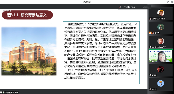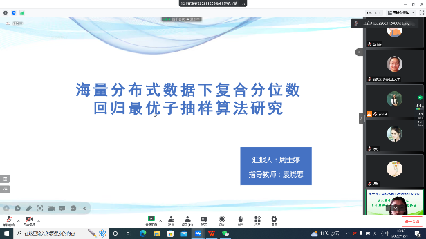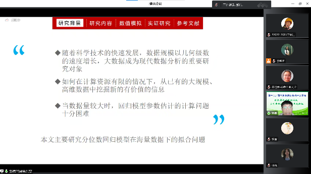 主论坛上,李勇理事长代表学会对论坛的举办表示由衷祝贺,高度评价了永利yl23411近年来快速发展的良好态势,表达了学会对本次论坛的大力支持和高度重视。在各位青年学者进行汇报之前,各位专家开展了热烈讨论交流并进行云合影。分论坛共邀请了23位青年学者进行学术报告,报告分为3个专题,汇报的研究方向有函数型数据研究、贝叶斯统计分析、其他模型与算法的研究等。青年学者积极开展学术报告,各位与会专家、公司经理王纯杰和统计系主任杨凯分别为青年学者进行点评。