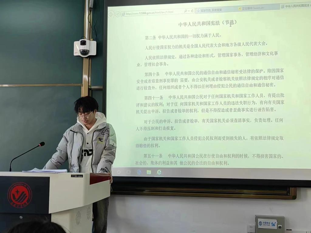 活动中,林利桁同学向全体人员宣读《中华人民共和国宪法》(节选)并让全员跟读。他指出,作为团学干部应自觉了解并学习宪法,积极成为宪法知识的宣传者,宪法严格遵守者。人民日报提出“宪法是国家的基石,遵守宪法是公民道德的基石。”团学干部应强化责任担当,带领各班组织宪法主题班会,让同学更多的了解宪法知识,通过系列宣传活动,让员工增强法律意识,自觉用宪法规范自己的行为,学习宪法、宣传宪法,深刻理解宪法的基本原则和精神。最后林利桁同学带领全体团学成员认真学唱《宪法伴我们成长》这首歌,正如歌词所写“求学受教,守土护疆,宪法为我们护航”,通过朗朗上口的歌词不仅渗透了宪法知识,而且激发了同学们对学习宪法的热情以及对宪法的敬意。