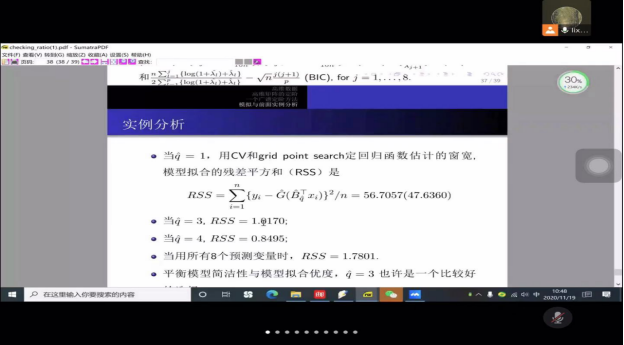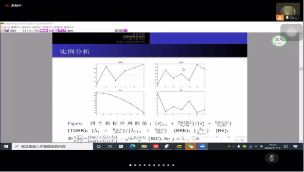 在报告会中,朱力行教授用通俗易懂的语言首先介绍了高维回归模型,进而说明了高维矩阵的定阶方法。提出了通过充分降维的方法把降维问题转化为定阶问题。而后又分步骤向大家介绍了一个广谱定阶方法。加深了师生们的理解。