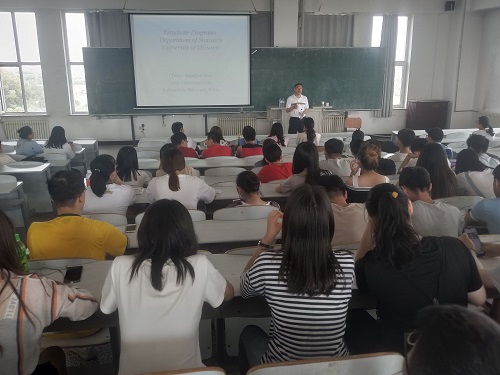 报告会上孙建国教授首先向同学们介绍了关于密苏里大学的大学系统,孙建国教授说密苏里大学的旧官方名称是University of Missouri-Columbia,密苏里有四个大公司区,分别是Columbia校区,Kansas City校区,St.Louis校区,和Rolla校区。为了让同学们更加全面地了解密苏里大学,孙建国教授又向同学们介绍了这所公司的历史发展、系研究生课程、系研究领域和学费等同学们关心的问题。其中着重介绍了系研究生课程,孙建国教授说,统计学硕士课程有Regular track、Applied track,重点是Biostatistics和Data Analvtics等课程。报告会接近尾声时,孙建国教授和公司员工互动,让同学们提问,解答员工们的相关疑问。最后孙建国教授祝愿公司员工学业有成。