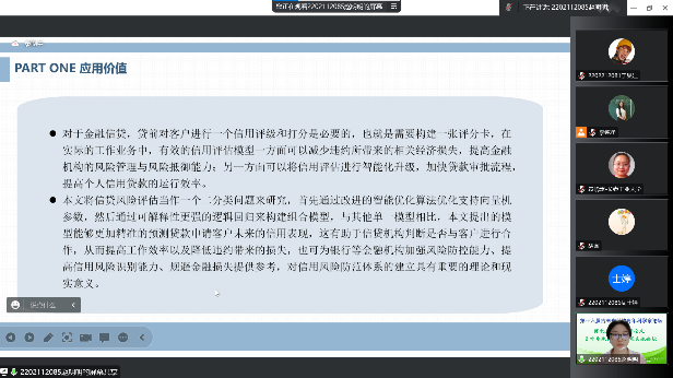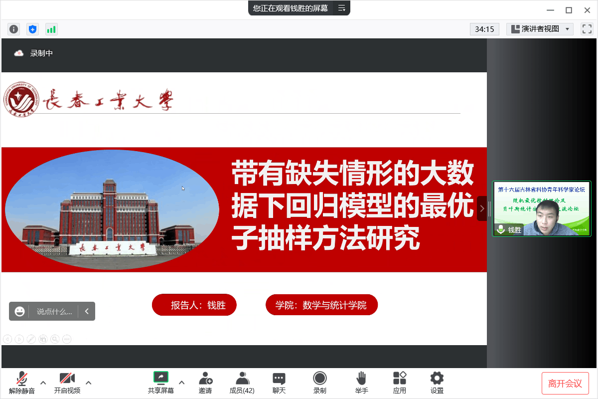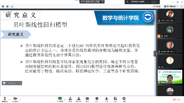 主论坛上,李勇理事长代表学会对论坛的举办表示由衷祝贺,高度评价了永利yl23411近年来快速发展的良好态势,表达了学会对本次论坛的大力支持和高度重视。在各位青年学者进行汇报之前,各位专家开展了热烈讨论交流并进行云合影。分论坛共邀请了23位青年学者进行学术报告,报告分为3个专题,汇报的研究方向有函数型数据研究、贝叶斯统计分析、其他模型与算法的研究等。青年学者积极开展学术报告,各位与会专家、公司经理王纯杰和统计系主任杨凯分别为青年学者进行点评。