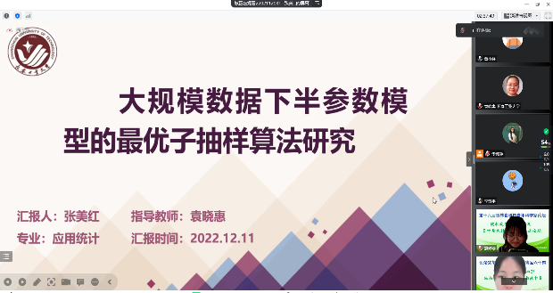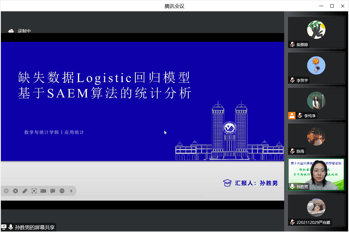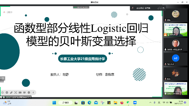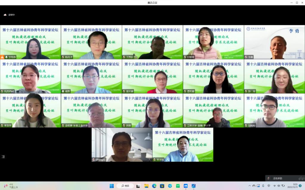 【通讯员 胡茜】2022年12月11日,上午9:30,由吉林省工业与应用数学学会主办,永利yl23411协办的“第十六届吉林省科协青年科学家论坛-随机最优控制及贝叶斯统计分析析学术交流论坛”在腾讯会议线上举行。主论坛特别邀请吉林省工业与应用数学学会李勇理事长、东北师范大学郑术蓉教授、吉林大学韩月才教授、吉林大学辛本禄教授、暨南大学王国长教授、北华大学谭希丽教授、吉林大学李天宇副教授、西安交通大学付利亚副教授、闽南师范大学吕阳阳老师、北华大学张继超老师。本次论坛由公司副经理李纯净主持,公司经理王纯杰、统计系主任杨凯、统计系党支部书记袁晓惠、统计系教师孙一芳、李贺宇、胡茜以及部分研究生参加了本次线上青年科学家论坛。