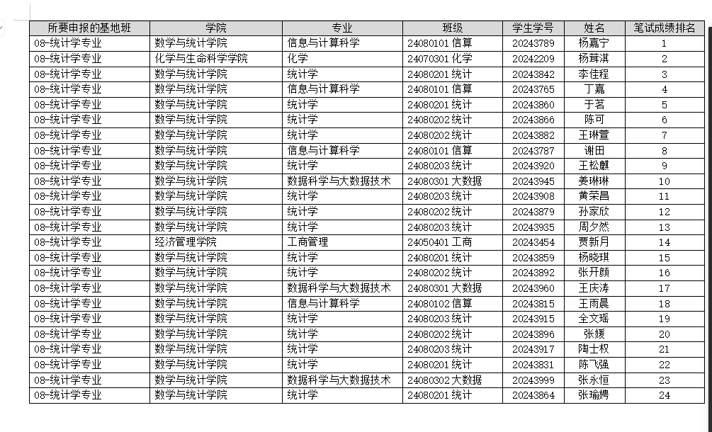 基础学科拔尖员工培养基地(统计学专业)笔试通过名单公示